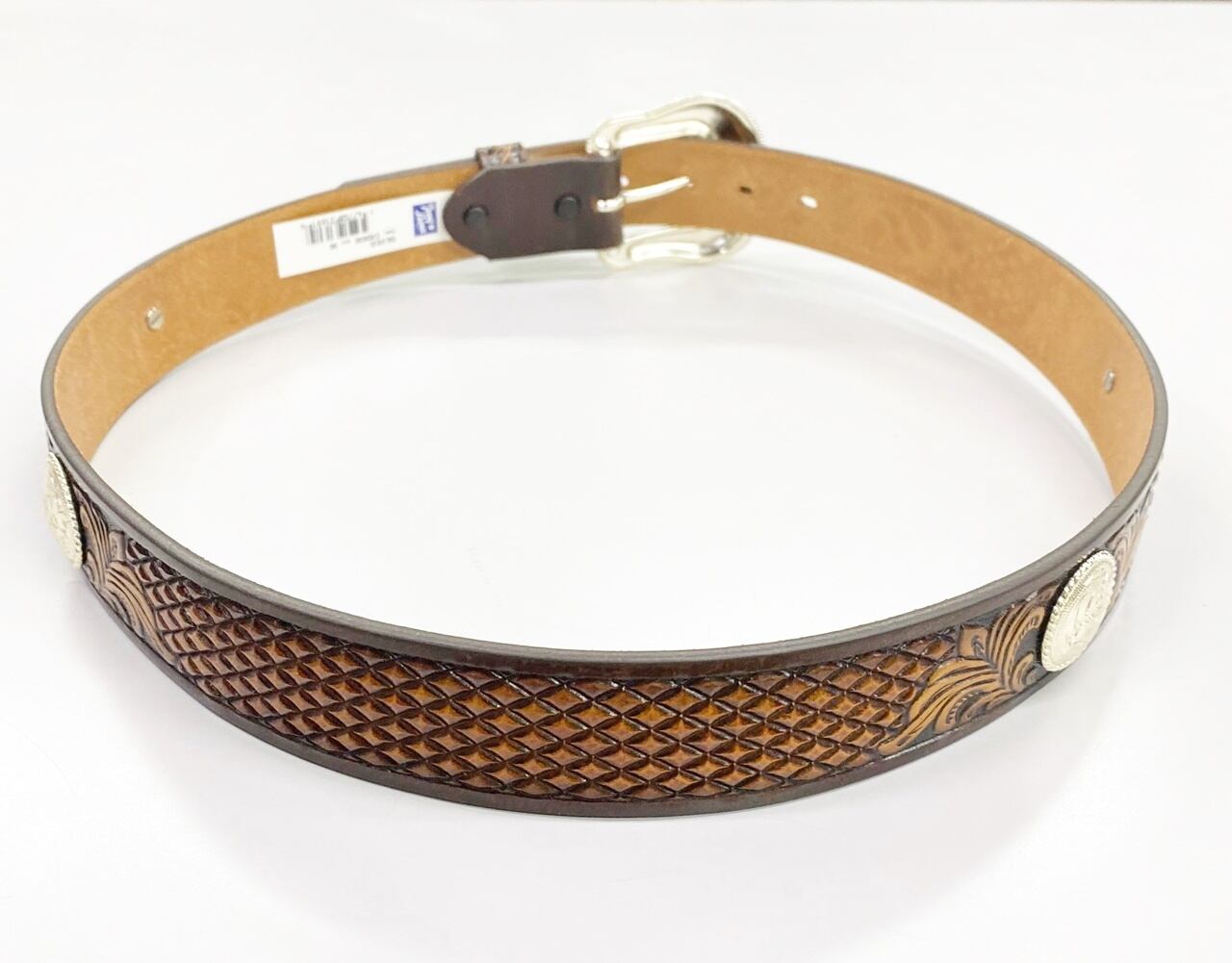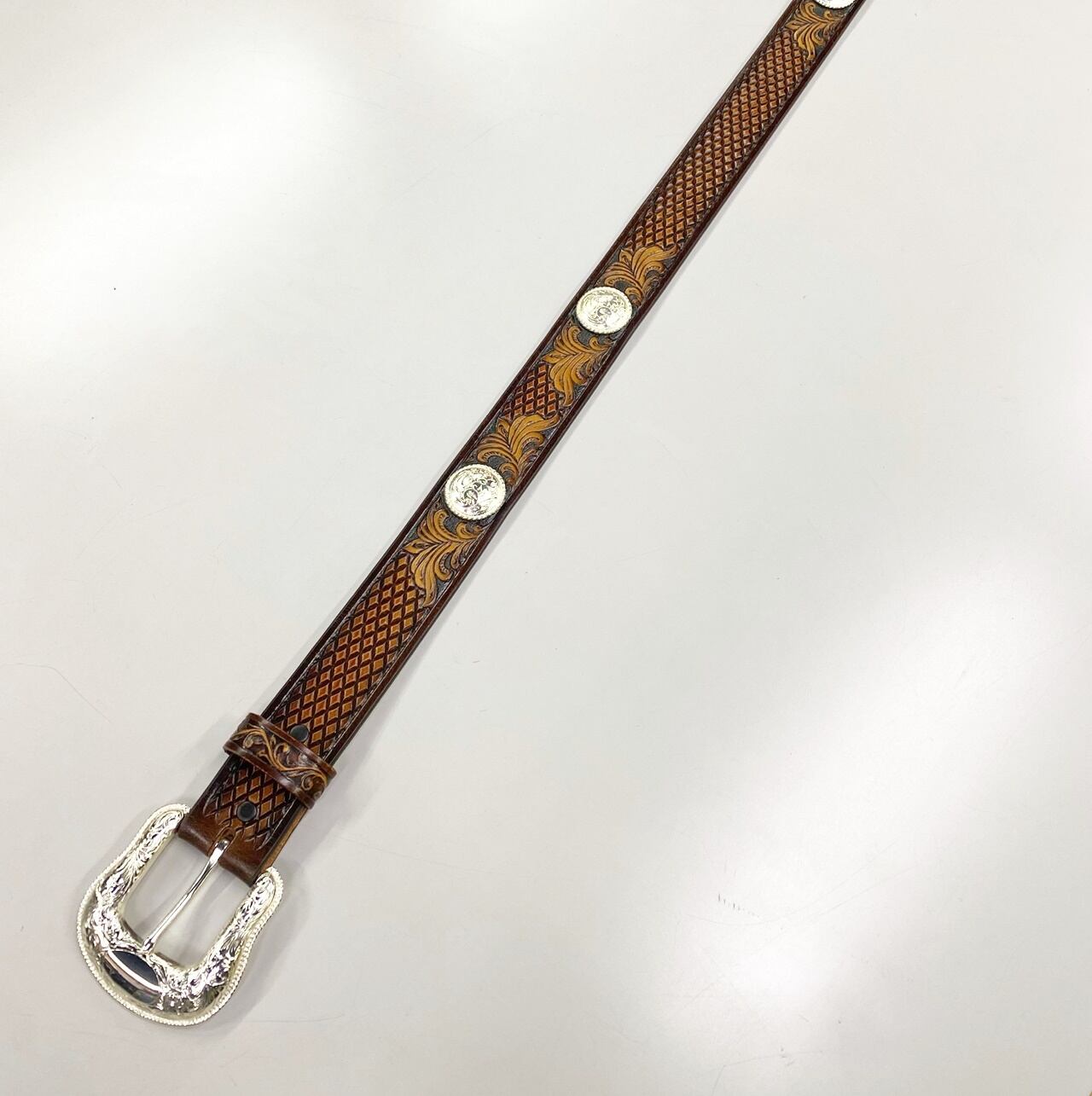本モデルは伝統的なウエスタンのフローラルモチーフが施されたベルトにシルバーのメダリオンが施されています。