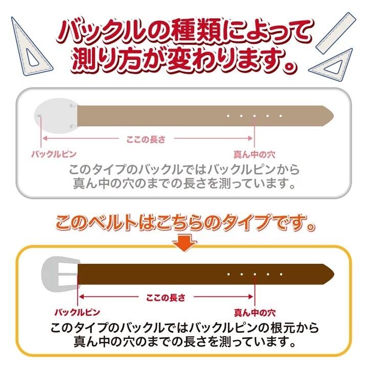 ※お持ちのベルトのバックルピンの根本からいつもお使いの穴までの長さを測ってサイズ合わせをおすすめします。