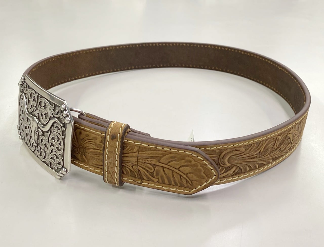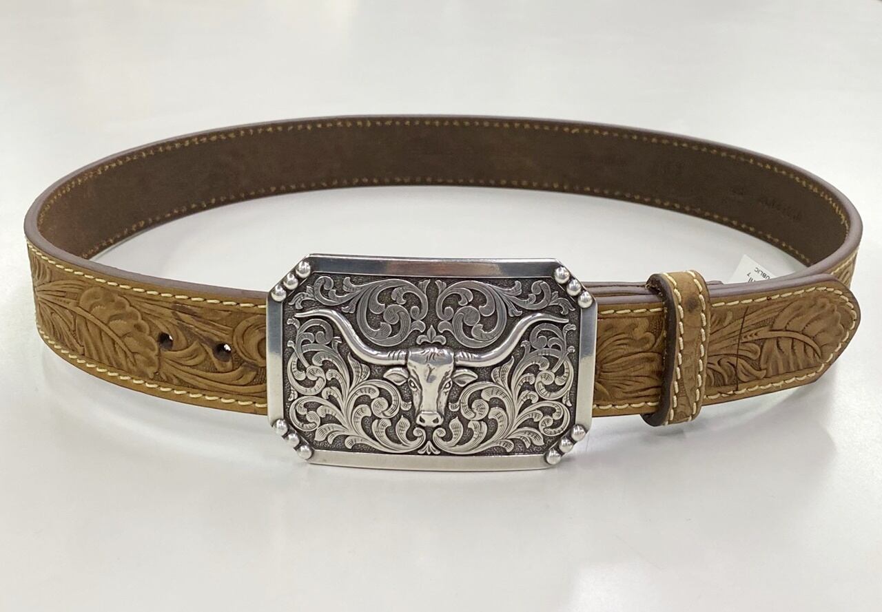 品名 3D MENS BELT 1-1/2" FLORAL EMBOSSED LONGHORN BUCKLE BROWN