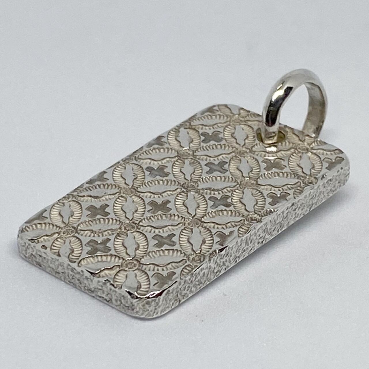厚みのあるドッグタグ風のプレートに繊細なスタンプワークを施しています。