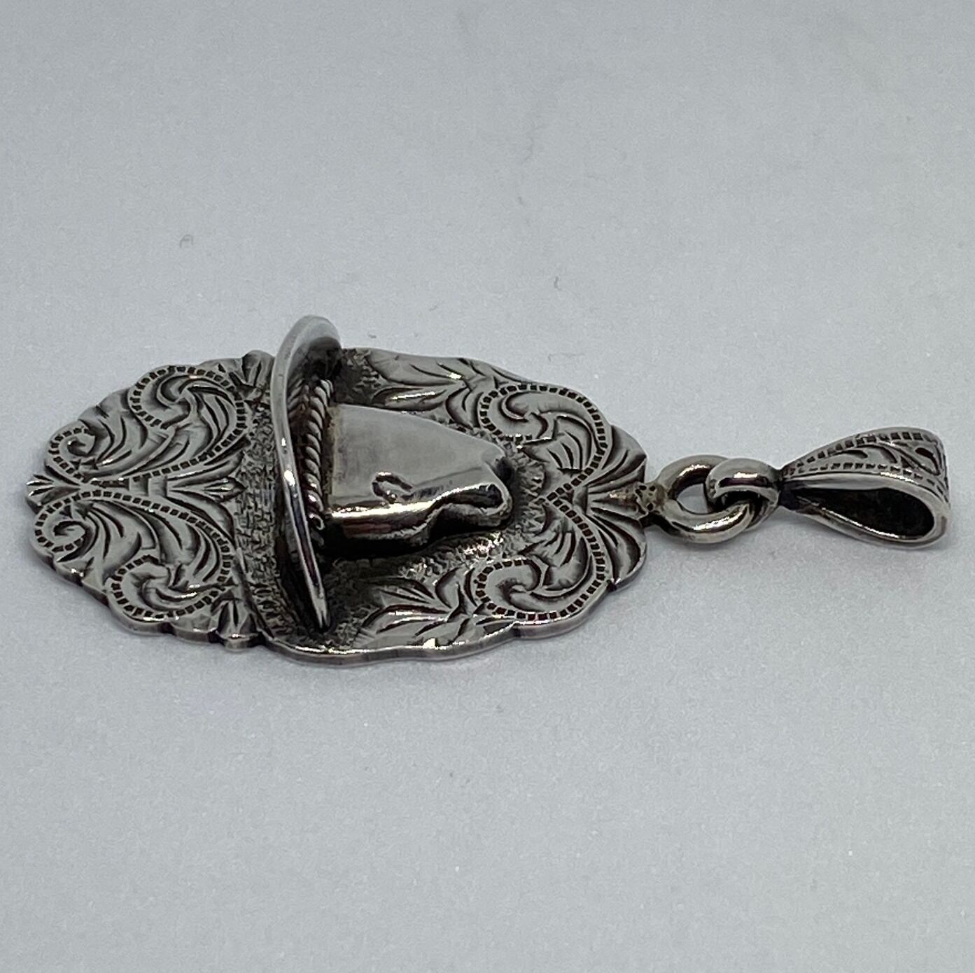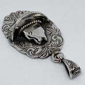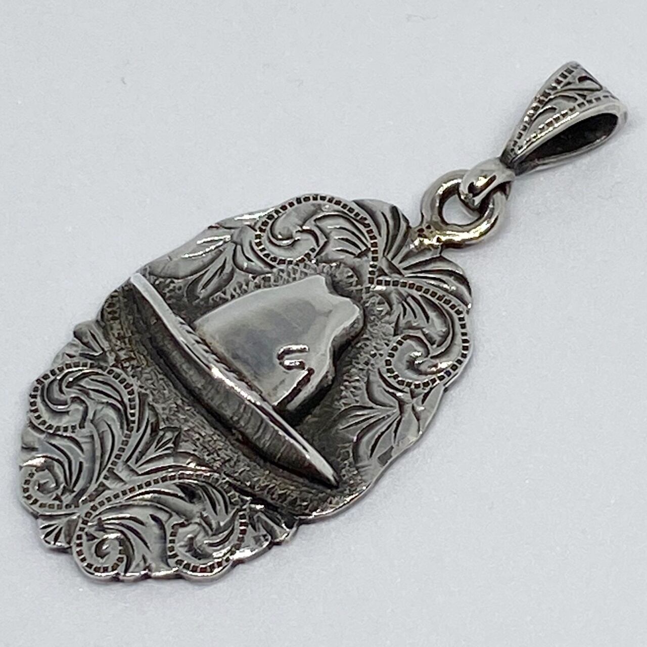 前面にハンドエングレイブを施したプレートに立体感のあるウエスタンハットをオーバレイしたペンダントです。