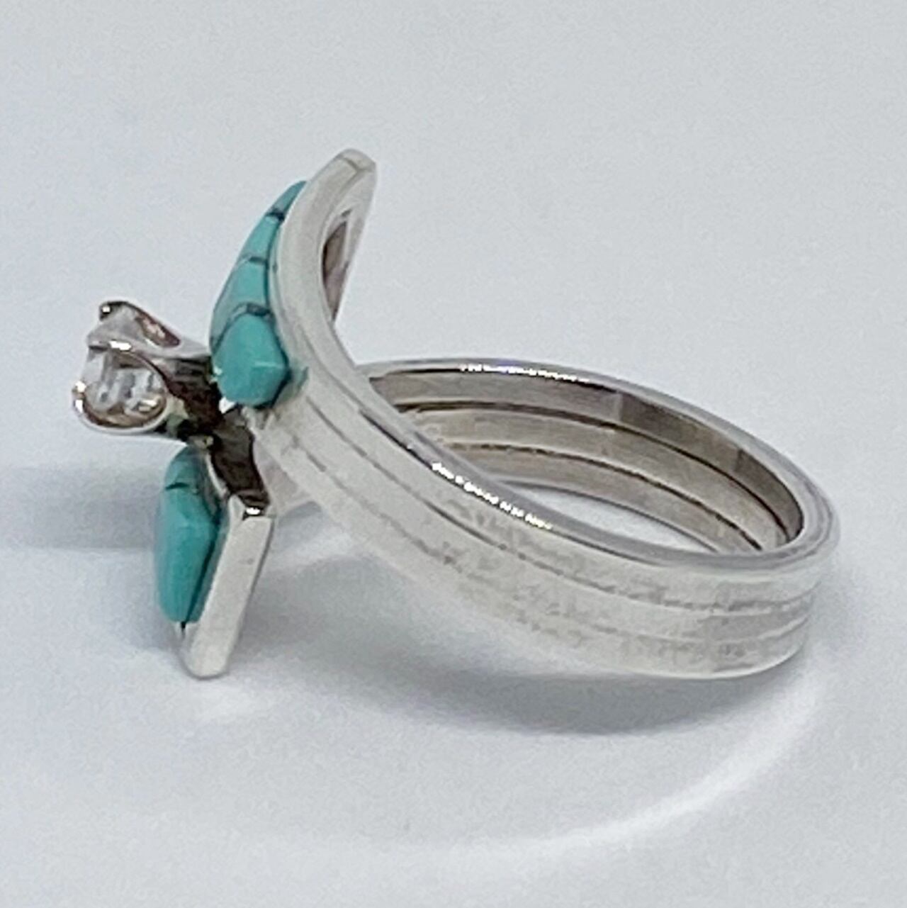 上下にターコイズがはめ込まれており、指に巻き付くようなデザインです。